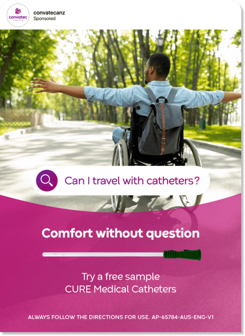 Seeing an opportunity for growth in Australia, Convatec has refocused to become synonymous with continence and intermittent self-catheterisation treatments — with a focus on people living with incontinence due to spinal injury. This focus stems from the consistent and lifelong catheter use of people living with spinal injuries. In a highly regulated industry where brand consideration is hard won, Convatec’s Forever Caring platform represents a promise of quality and intangible value to existing and new customers.