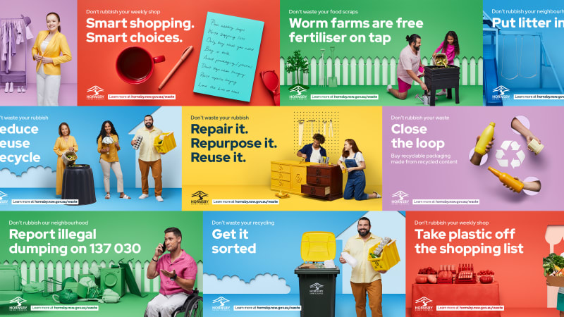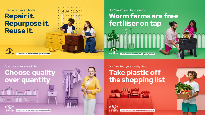 Designed to be applied over a 1-2 year period, Hornsby Shire Council needed a suite of single-minded messages to target local waste management issues when needed. So we created 15 bespoke executions, each clearly and colourfully promoting the ideal resident action for each waste stream — from soft plastic to food waste to unwanted textiles.