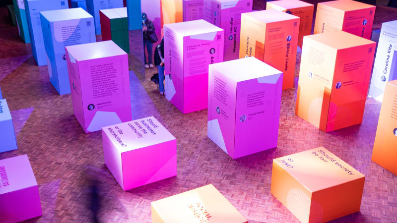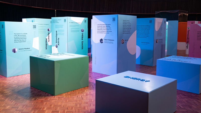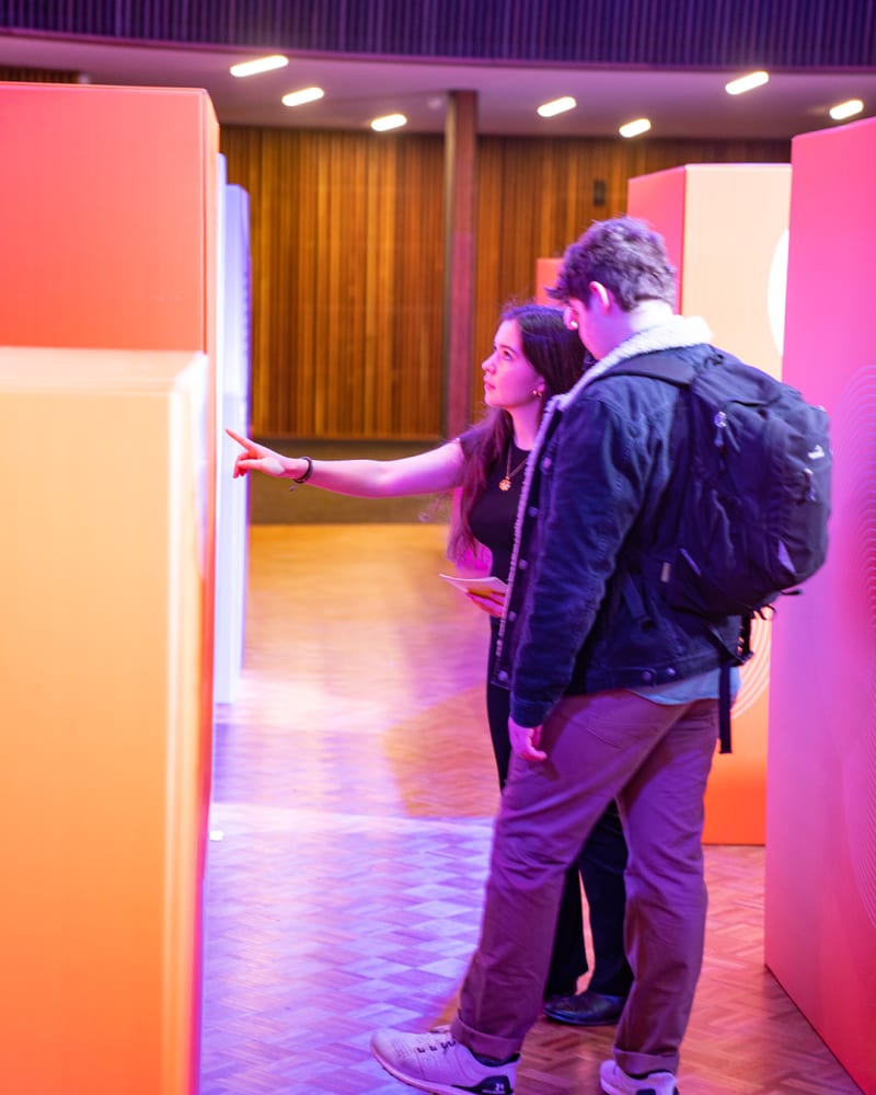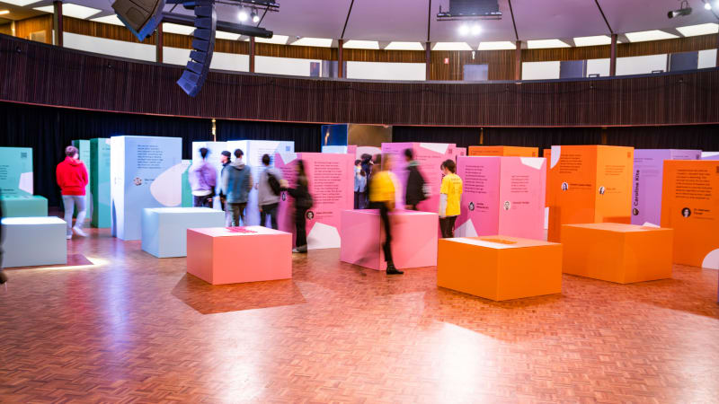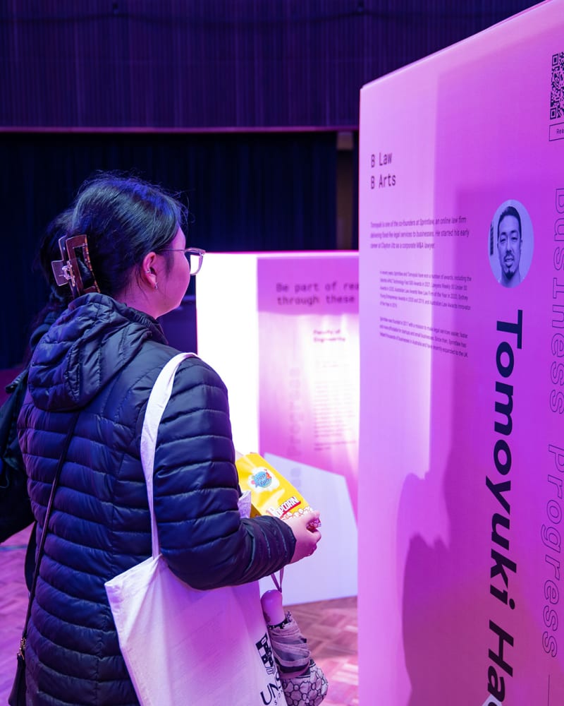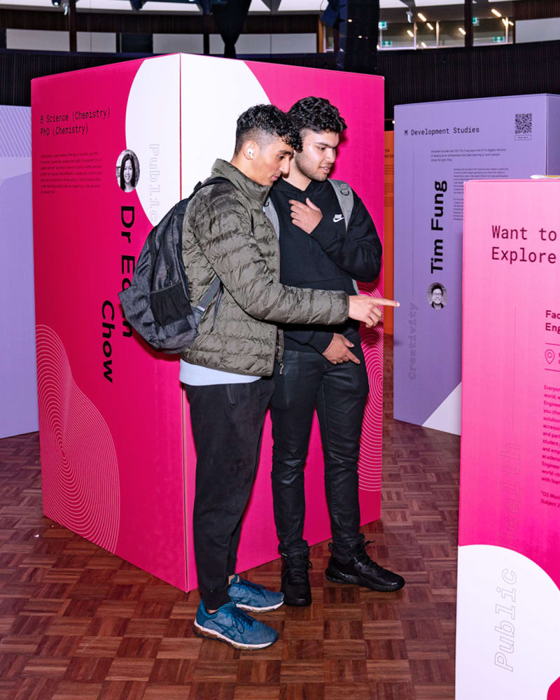 We build an open plan maze consisting of 46 rectangular pillars, each showcasing a unique alumni story, curated by fields of interest instead of faculties. This allowed us to create a non-linear experience of study and career pathways — a tactile experience that would build stronger connections with UNSW’s offering.