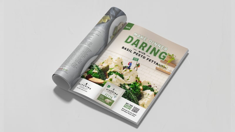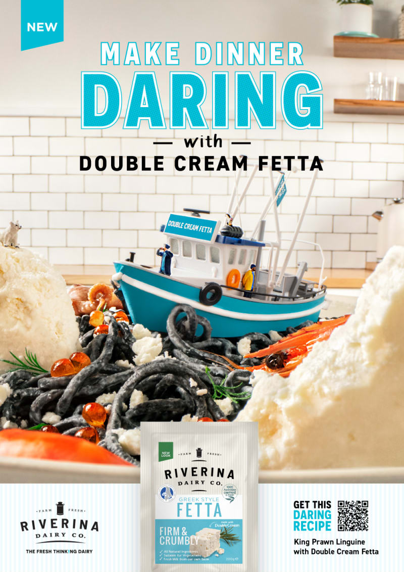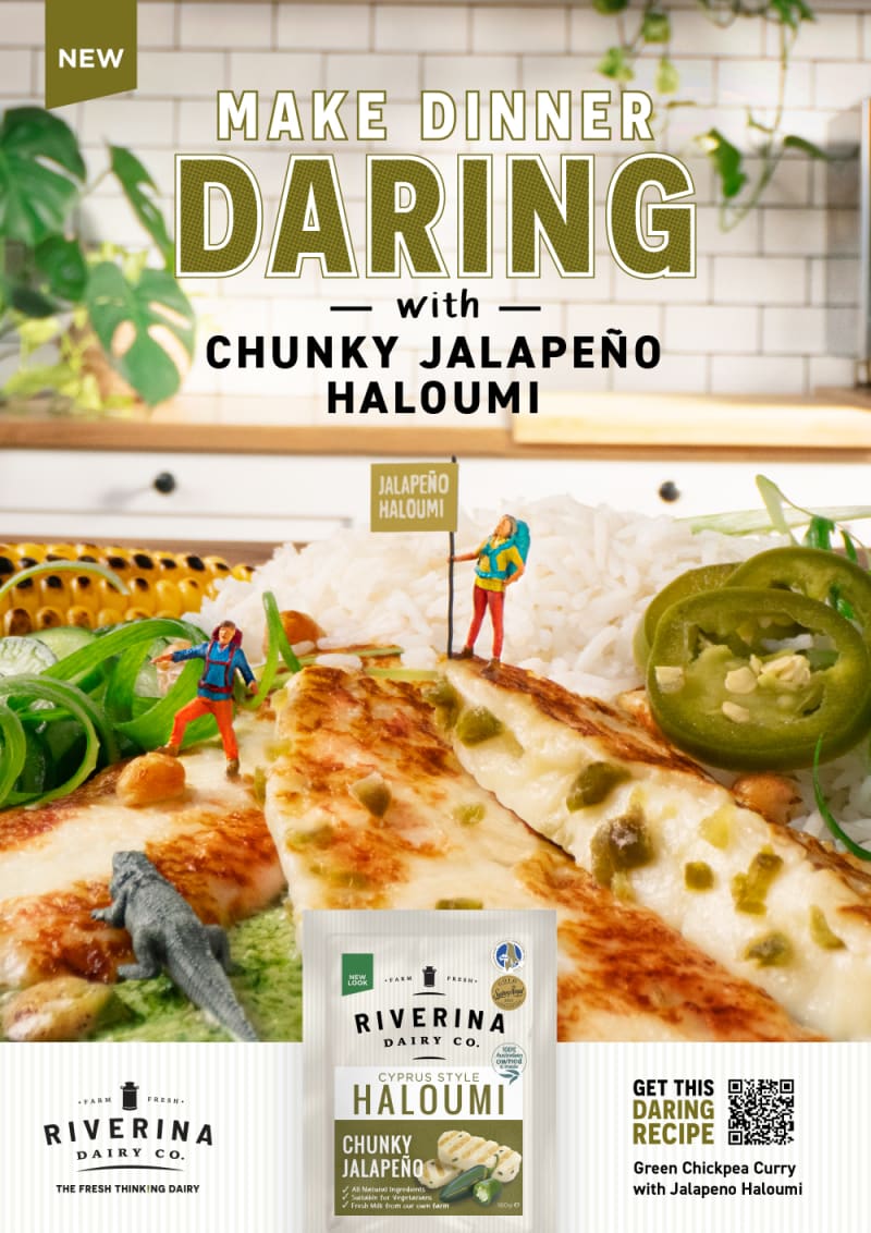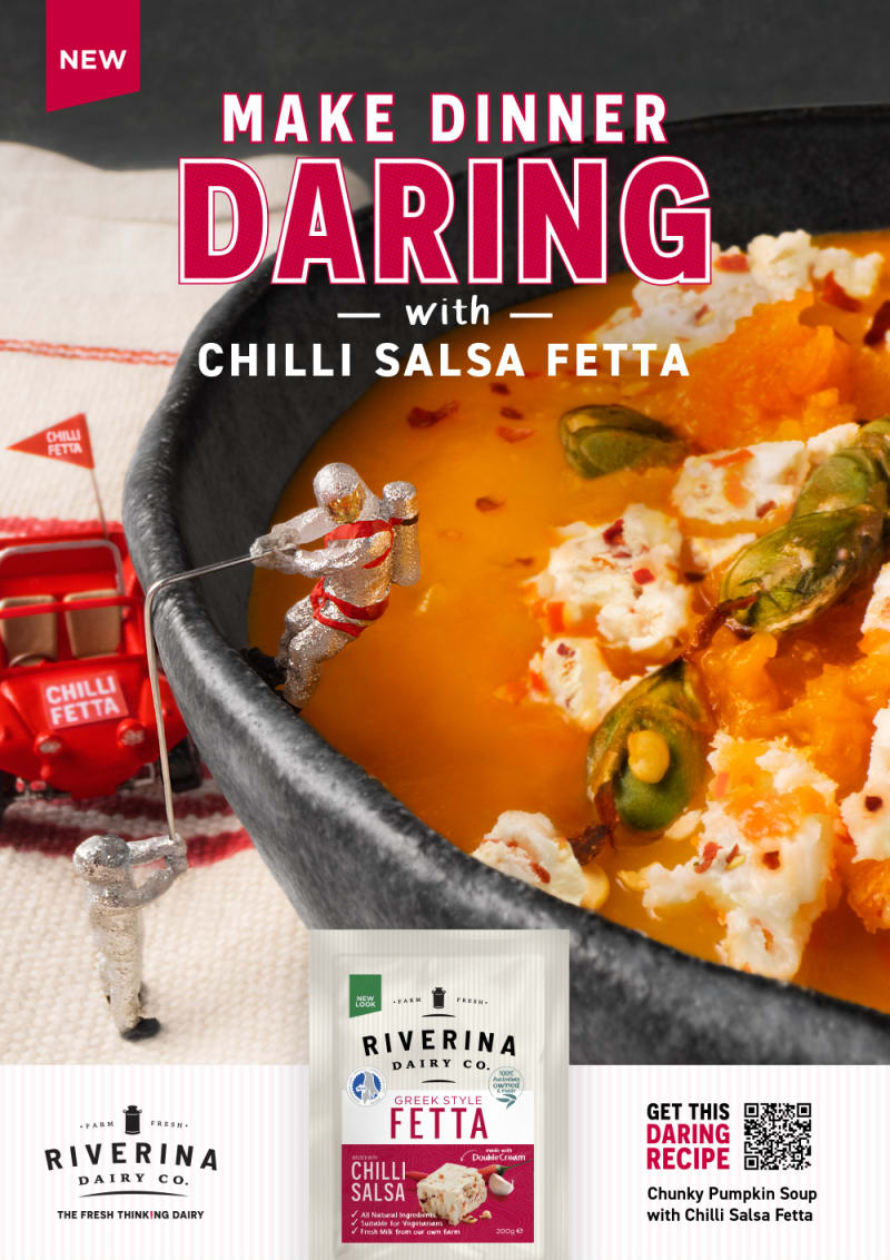 Riverina Dairy Co. came to us to launch their new consumer range of flavour-infused fetta and haloumi in Coles and independent supermarkets. They’d recently rebranded and were armed with a new creative platform: The Fresh Thinking Dairy. While every cheese brand can claim farm-freshness and authenticity, we needed to create the most fresh thinking solution to help the brand standout in the dairy aisle.