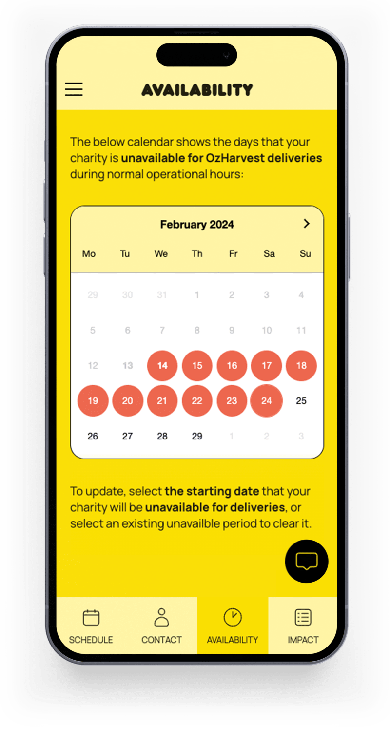 There was no existing system that allowed charities to easily communicate their availability for food donation deliveries from OzHarvest. This meant that some deliveries would arrive outside charities' opening hours and the drivers would be unable to contact them due to outdated information.