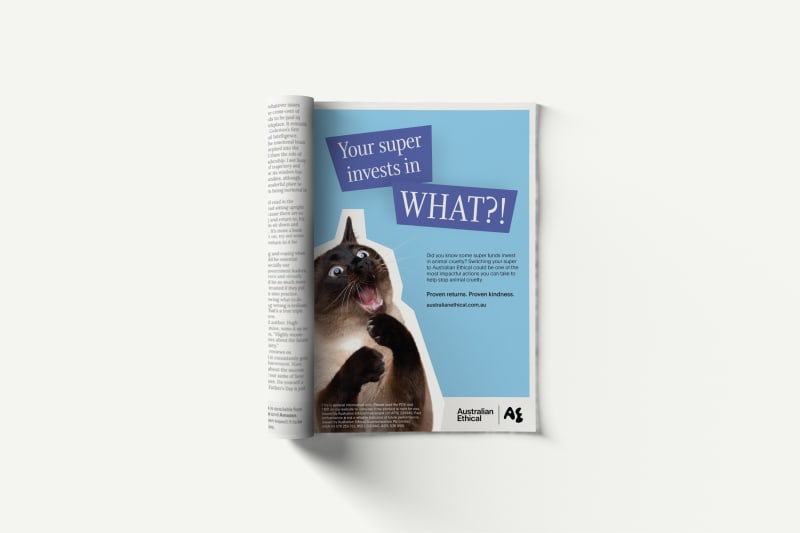 Australian Ethical approached us to tackle a touchy subject — animal welfare. More specifically, how to inform Australians that their superannuation investments may be contributing to animal cruelty without their knowledge. So we set about showing people that moving their money into a transparent and ethical fund can make a positive difference, as well as be a sound financial investment.