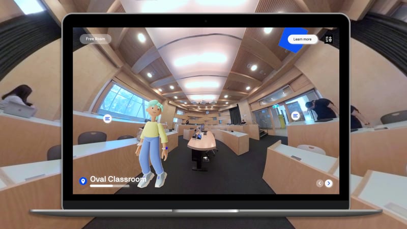 Guided by the jade-haired and 3D-rendered Alex, the tour offers a gamified experience through a choose-your-own-adventure narrative tailored to the user’s academic interests. Users are immersed in a completely 360-degree environment encompassing 17 scenes and 9 faculties and schools, with interactive hotspots and free-roam mode included throughout.
